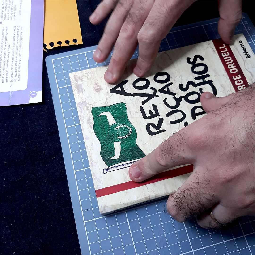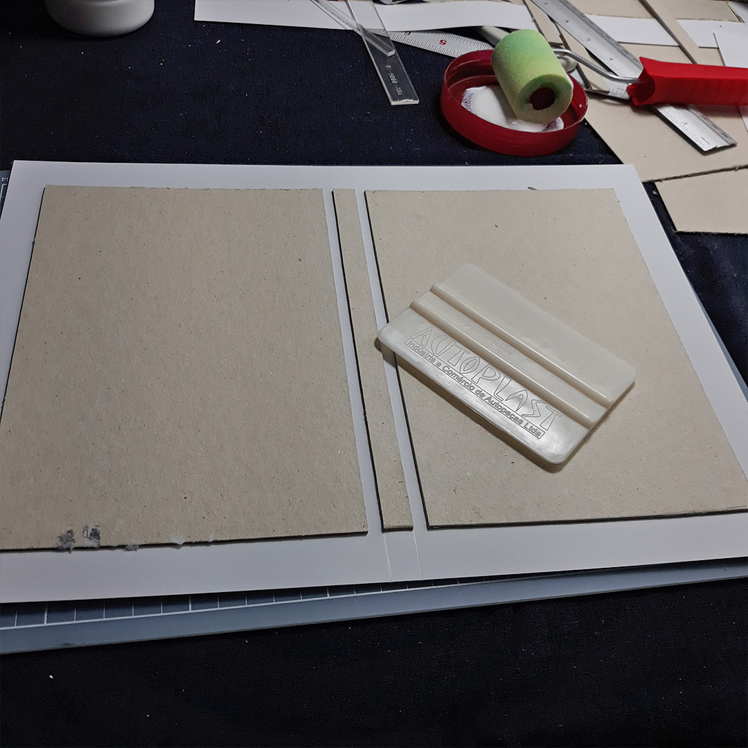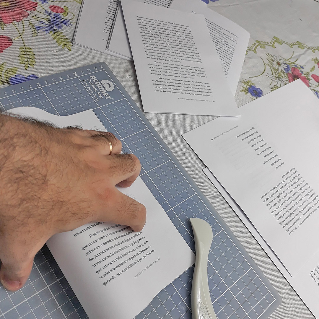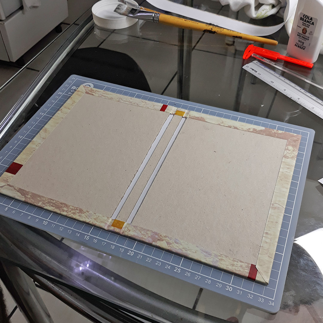 Colagem da impressão da arte da capa no papel paraná e capa dura no miolo do livro