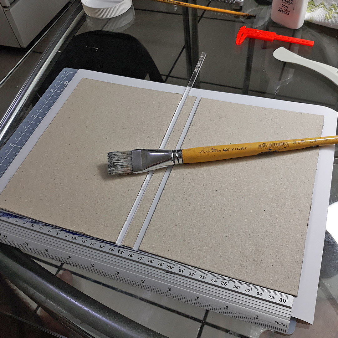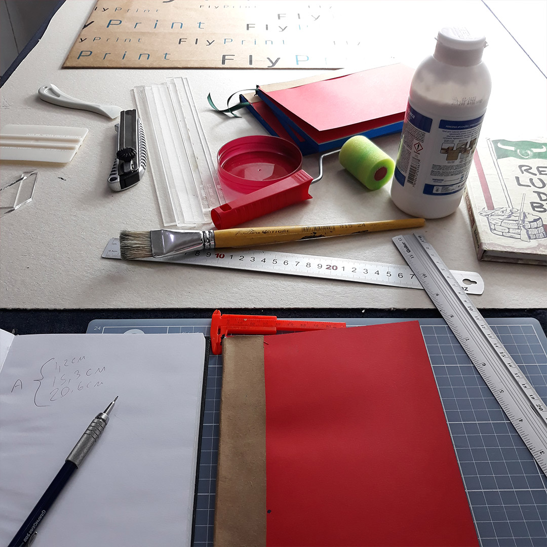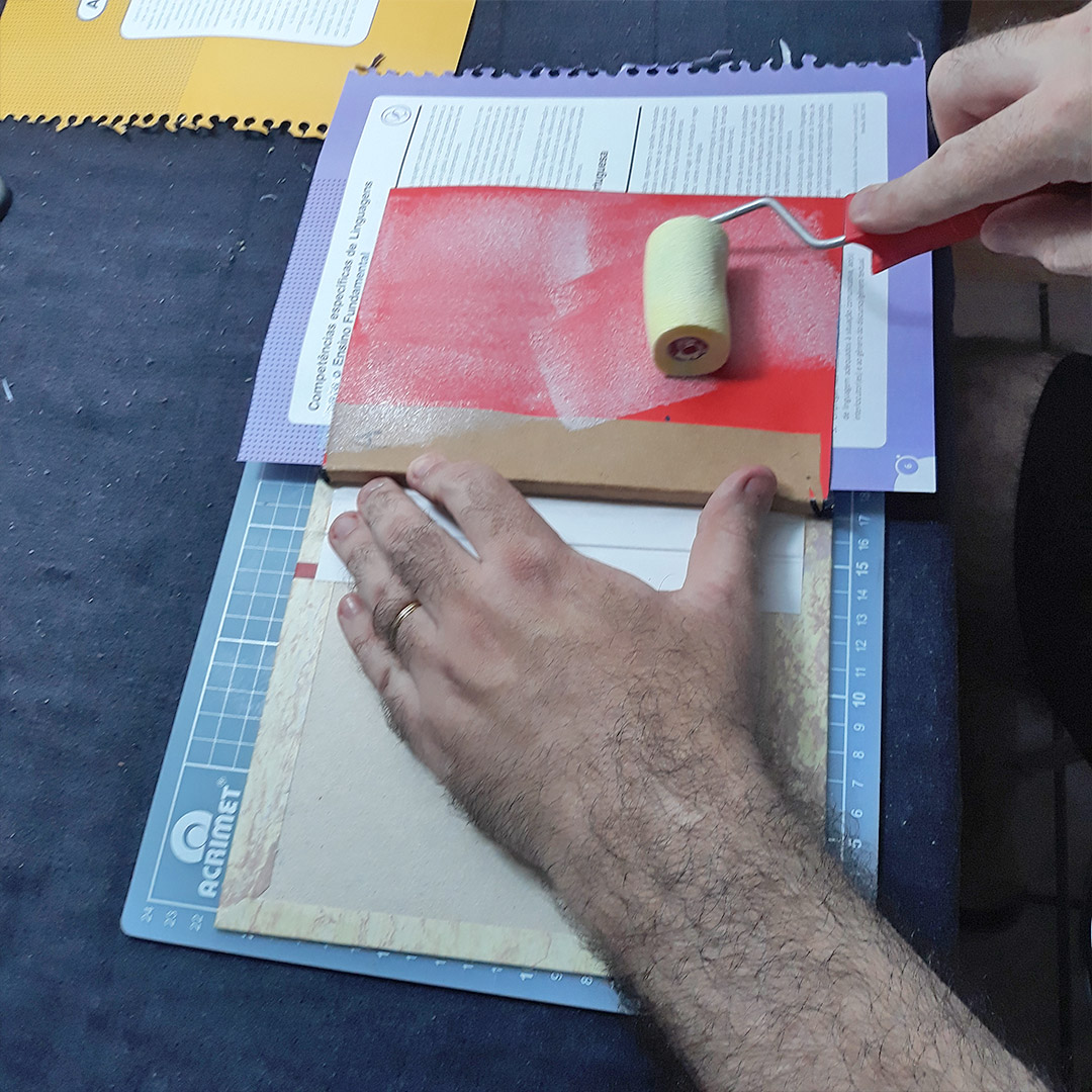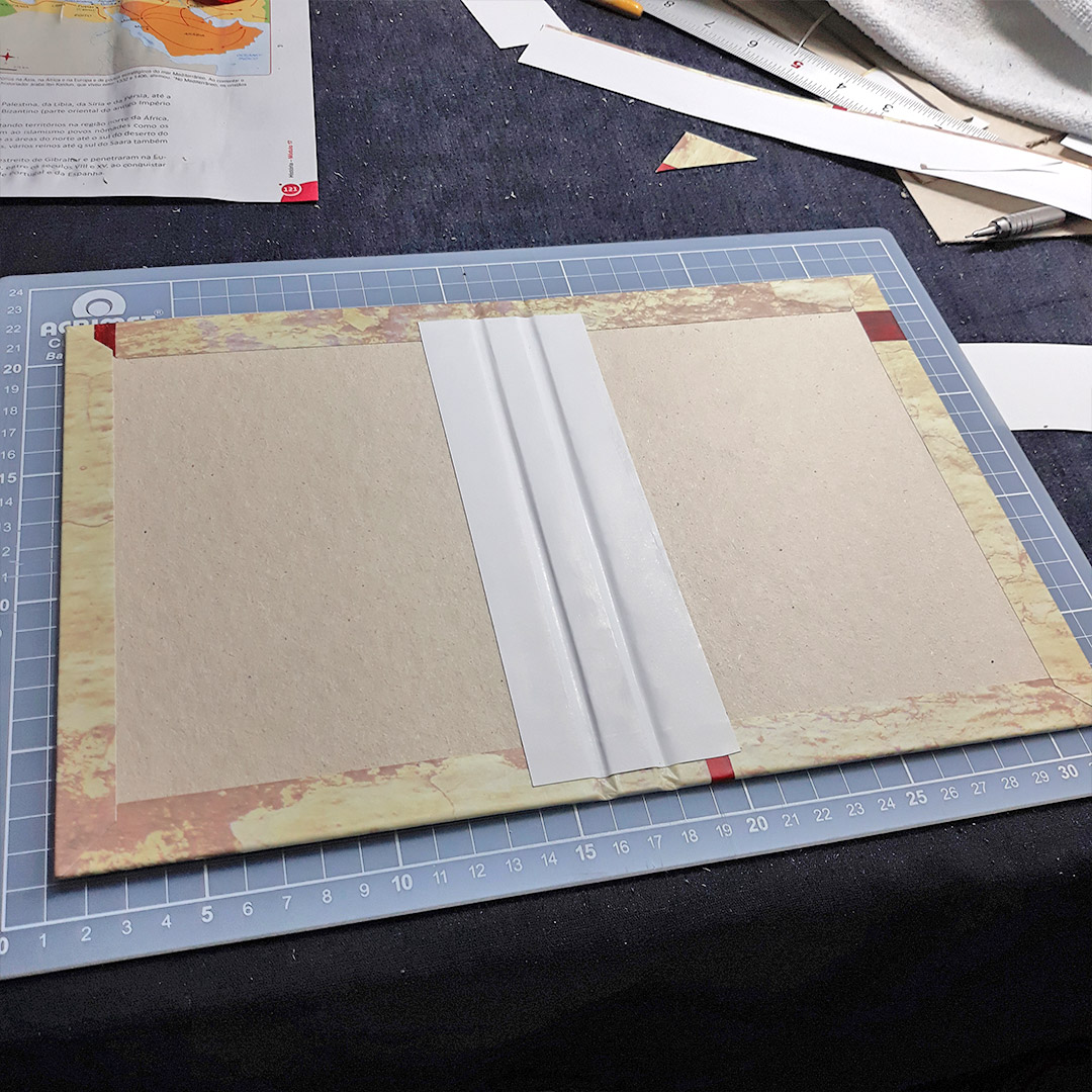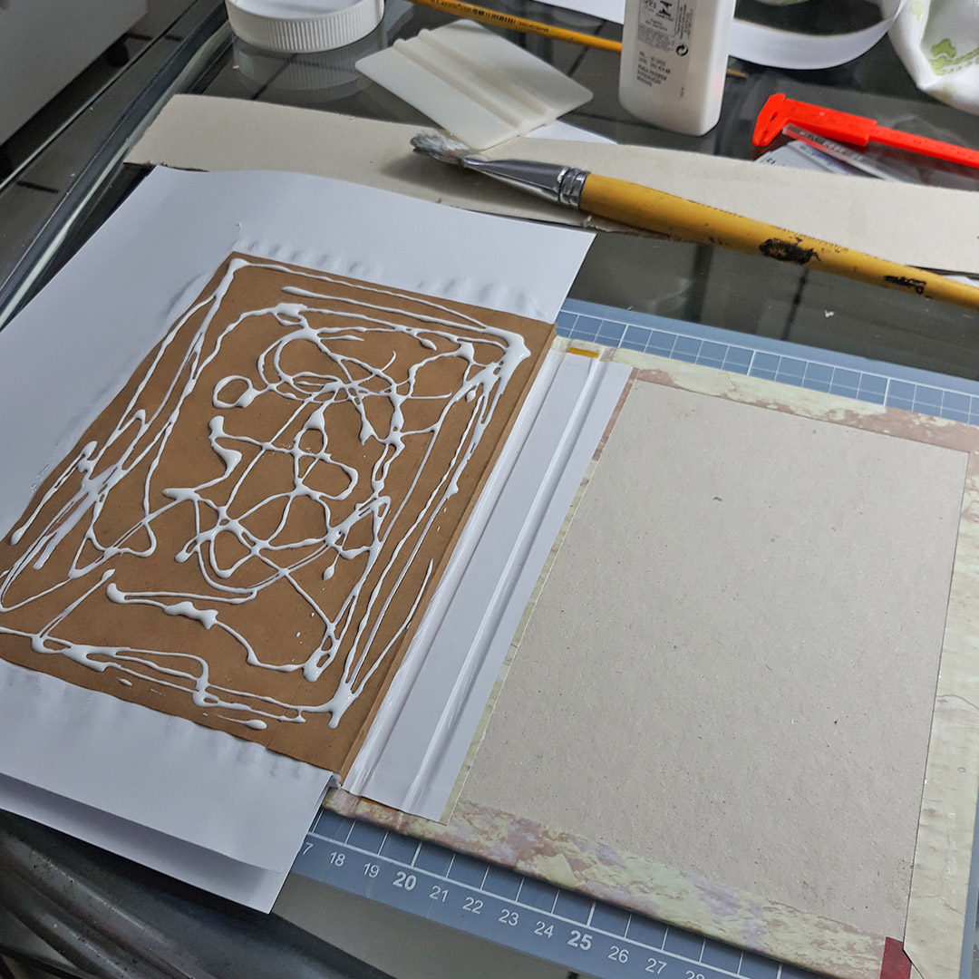 Colagem da impressão da arte da capa no papel paraná e capa dura no miolo do livro