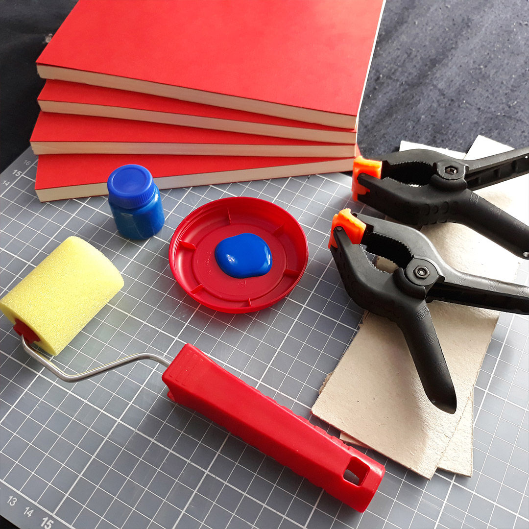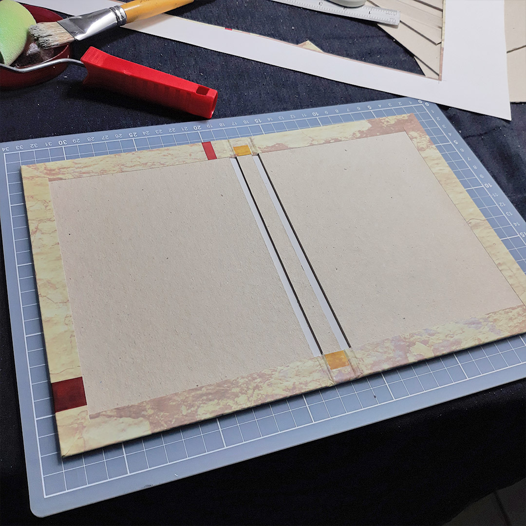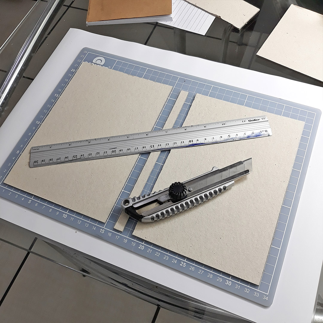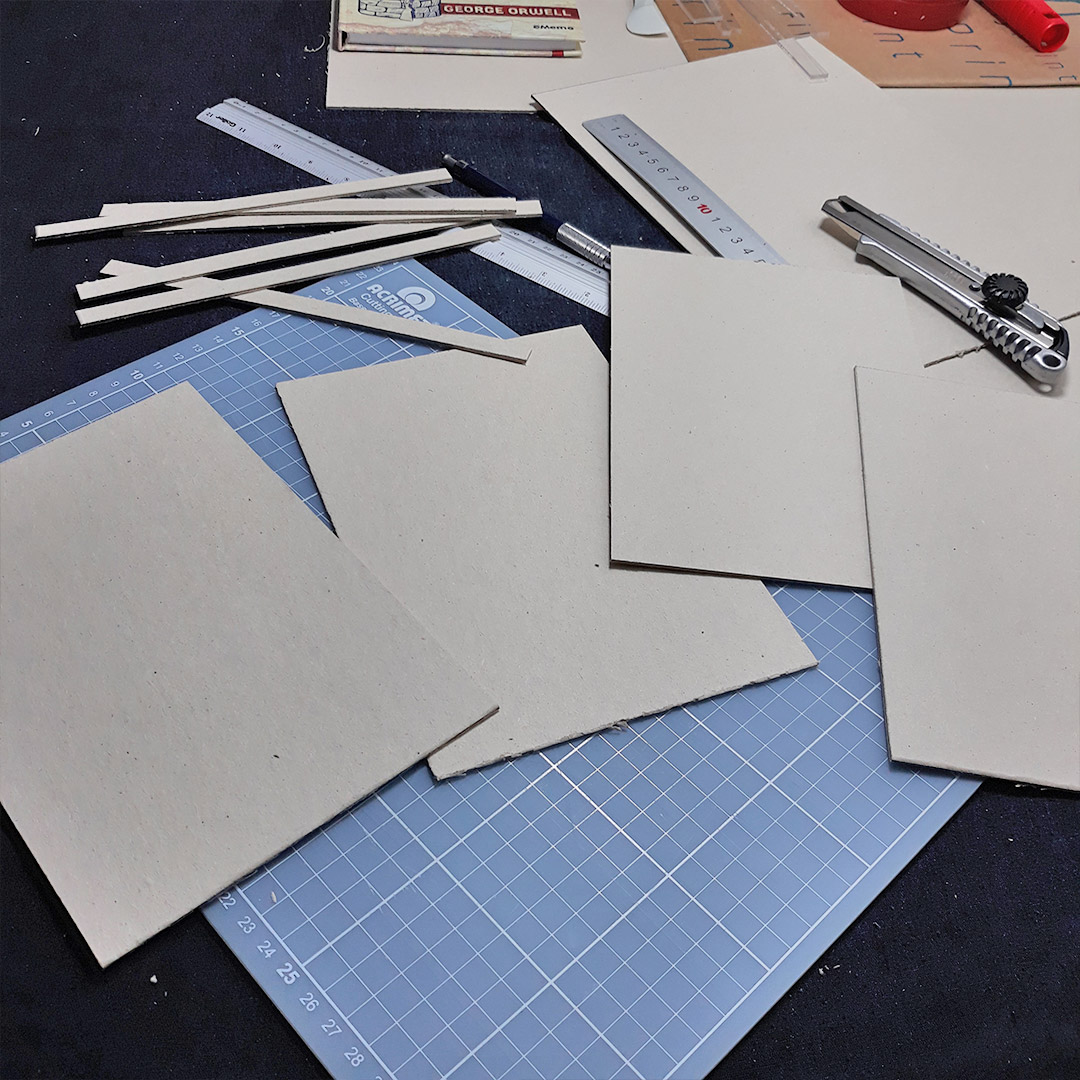 Colagem da impressão da arte da capa no papel paraná e capa dura no miolo do livro