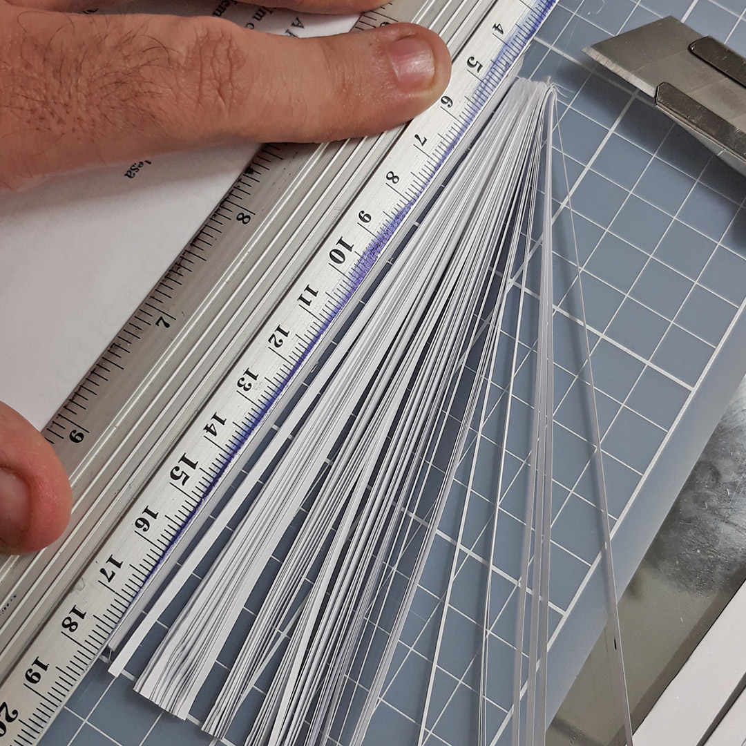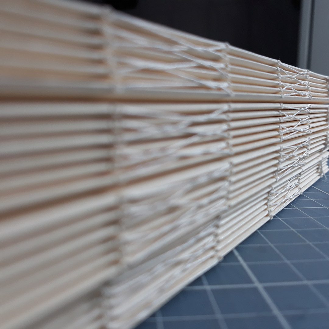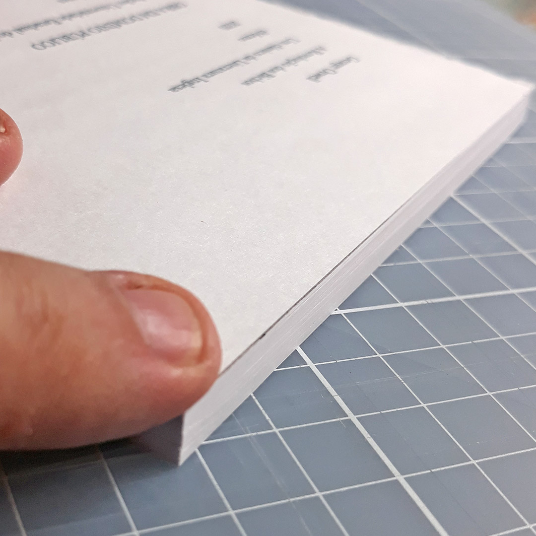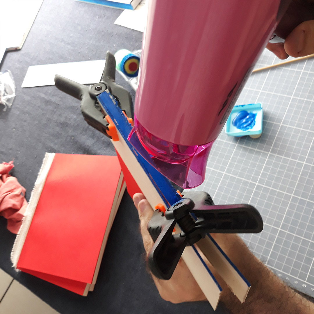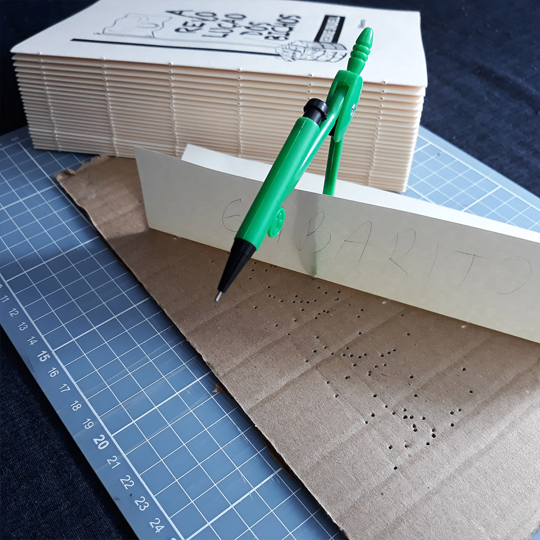 Colagem da impressão da arte da capa no papel paraná e capa dura no miolo do livro
