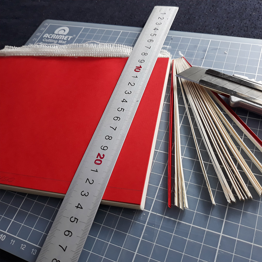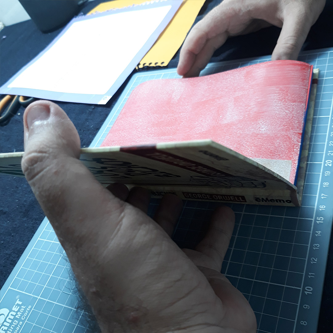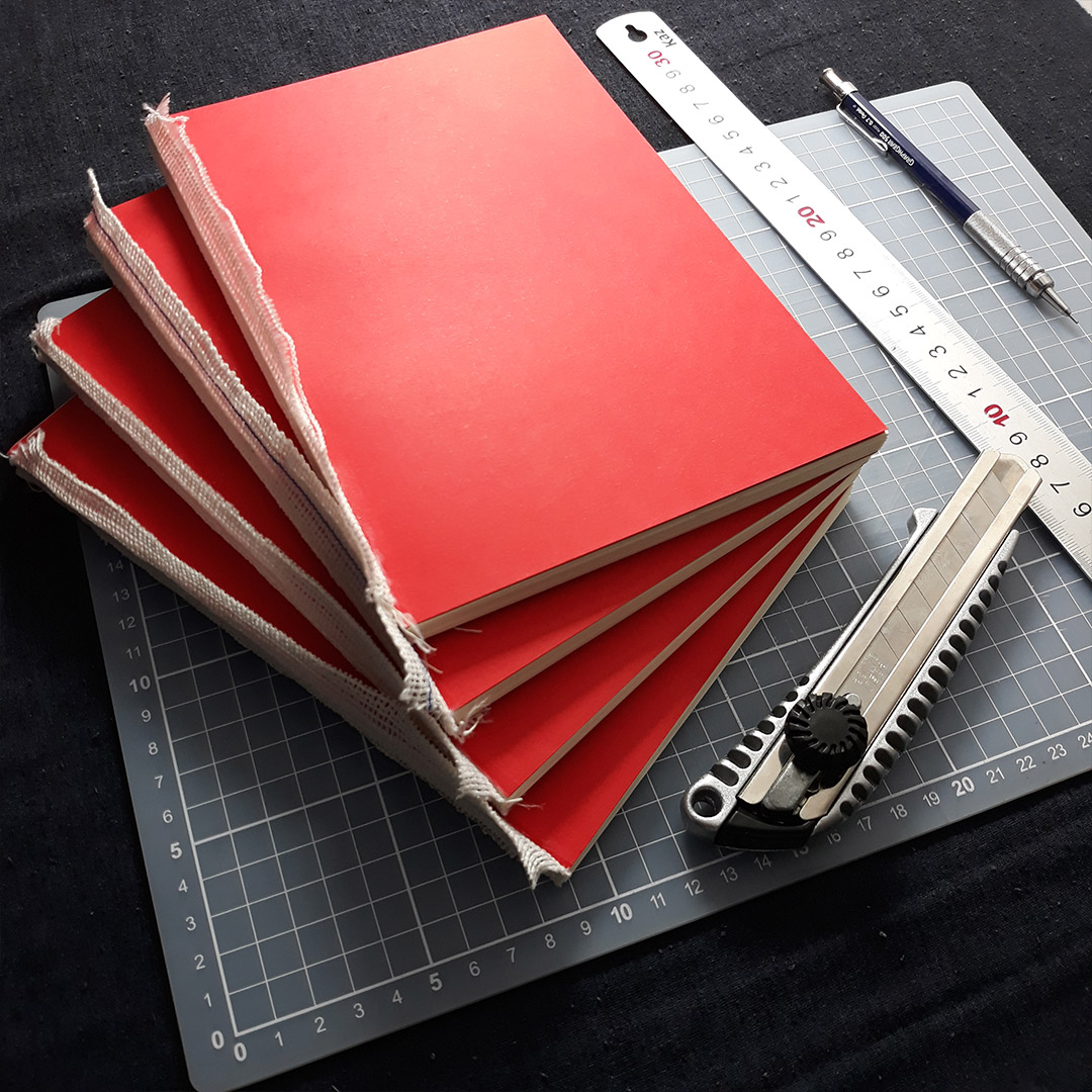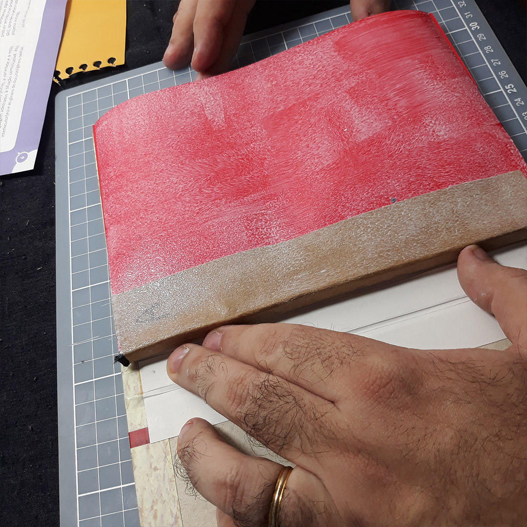 Colagem da folha de guarda vermelha, colagem da lombada e reforço com tela