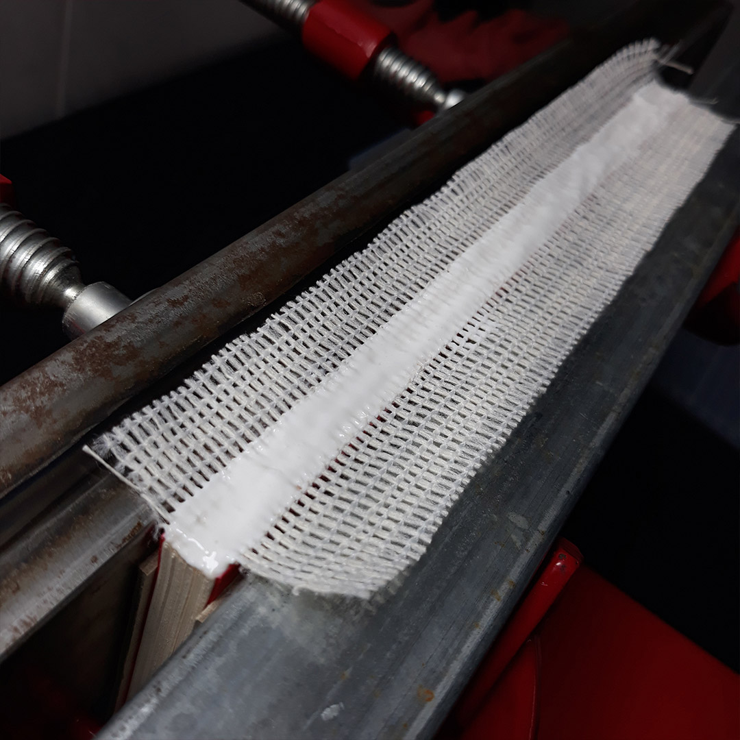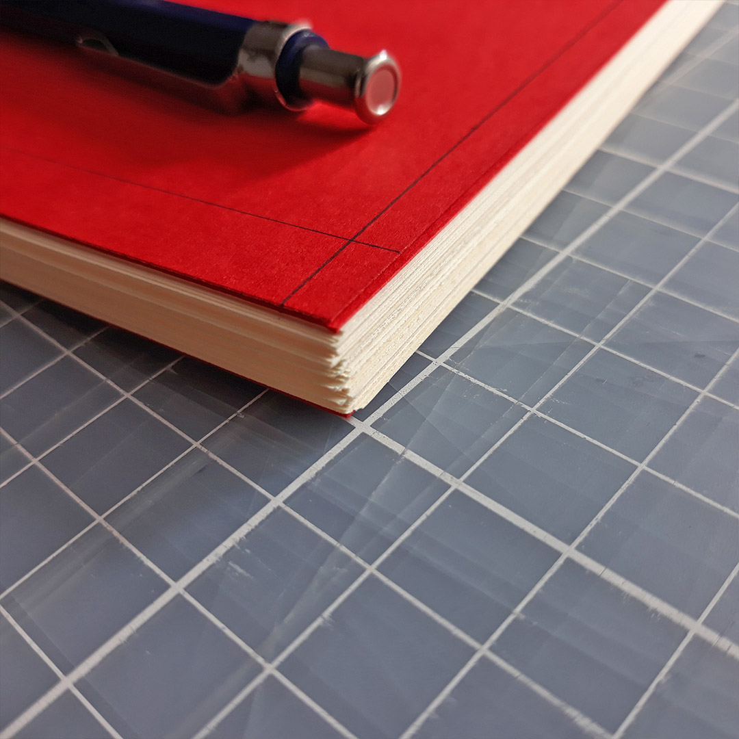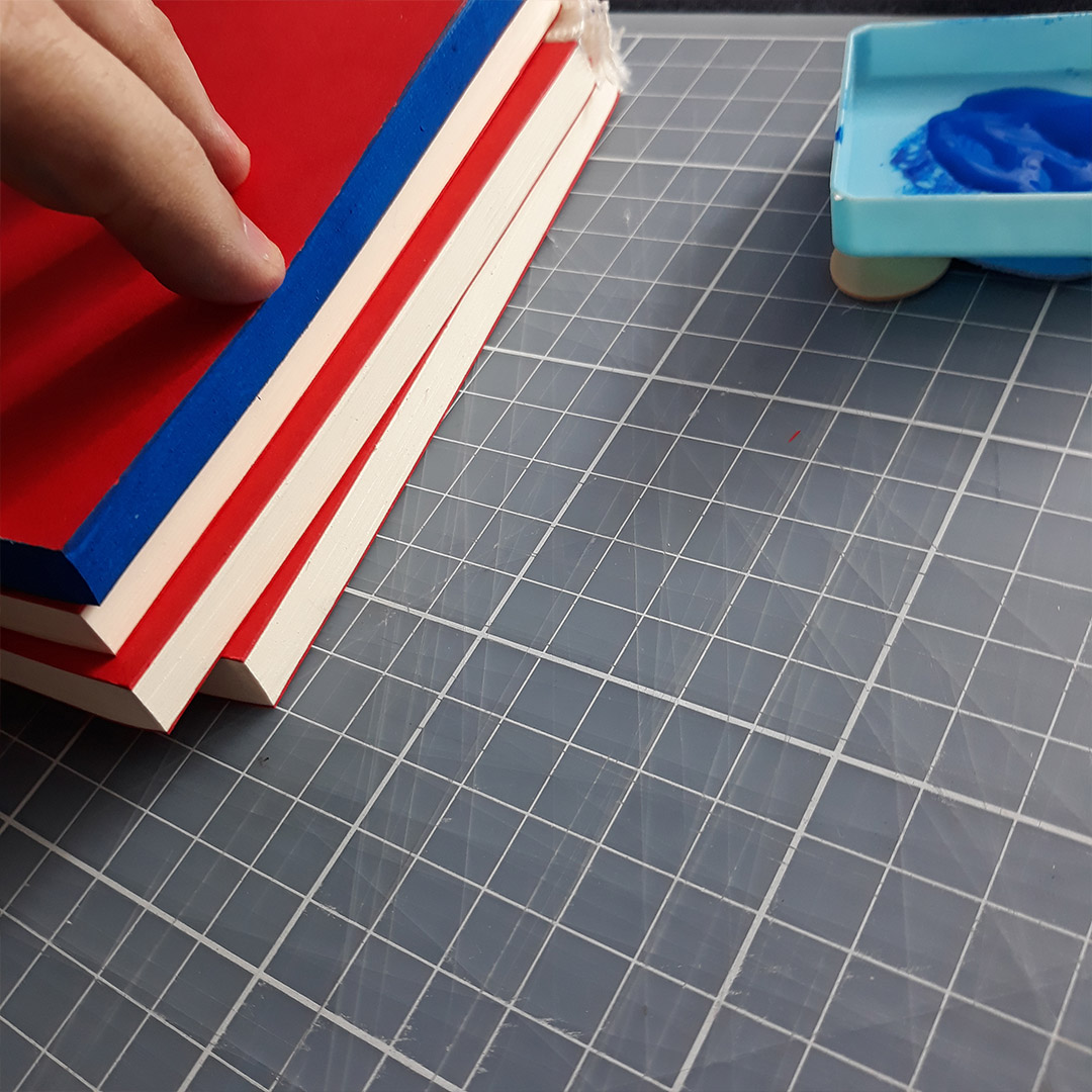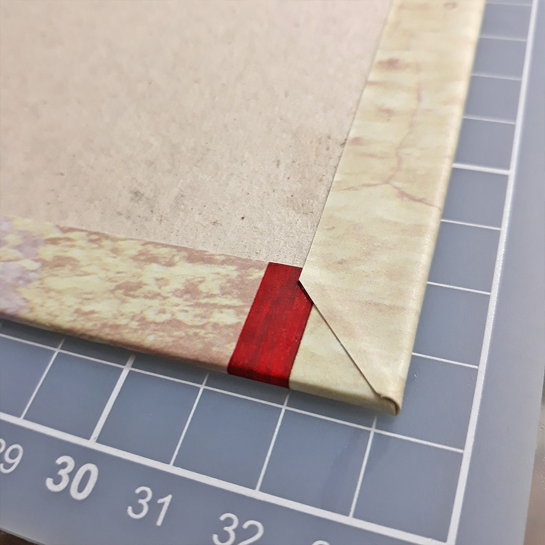 Colagem da folha de guarda vermelha, colagem da lombada e reforço com tela