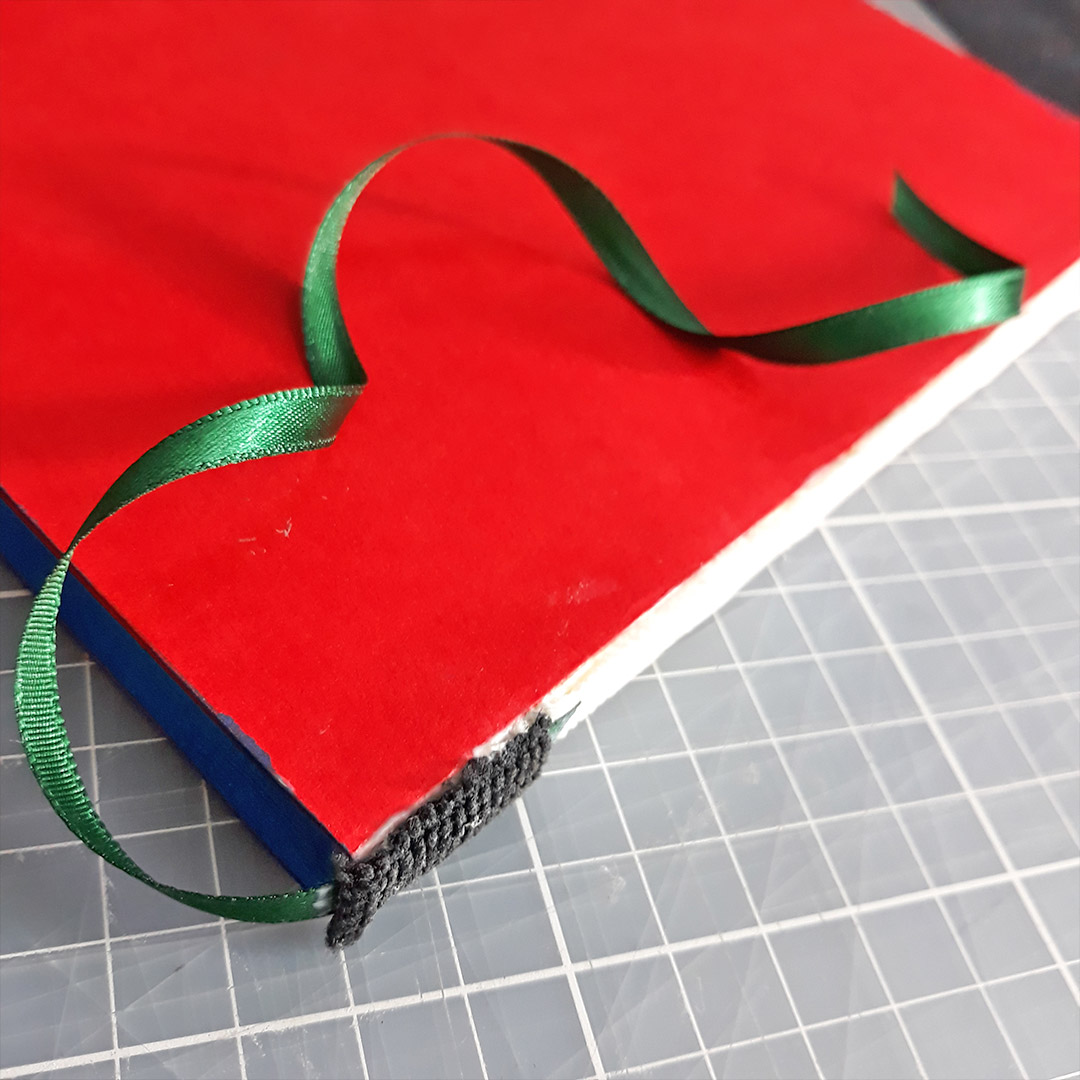 Acabamento do cabeceado preto, fita marca página verde e reforço de papel craft unindo lombrada e folhas de guarda