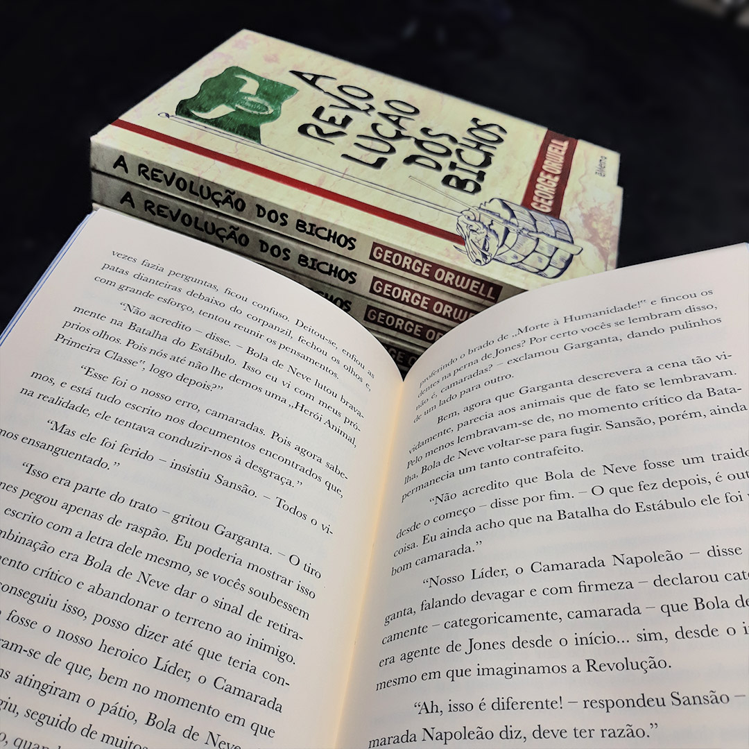 O texto base escolhido foi A Revolução dos bichos do autor George Orwell, extraÃdo da versão digital produzida pela Universidade Estadual do Norte do Paraná, disponÃvel gratuitamente em: http://www.ccp.uenp.edu.br/e-books/lituniv/2015-gorwell-rev_bichos.pdf.